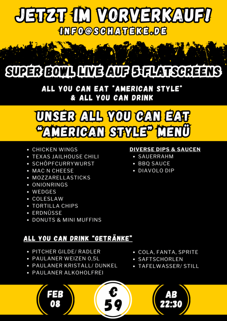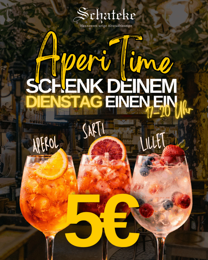 Bekannt ist die Schateke für den Meter frisch gezapftes Bier und Lütje Lage. Fußballfans ist die Schateke natürlich auch als Sportsbar bekannt – mit einem umfangreichen Live-Sport Angebot.